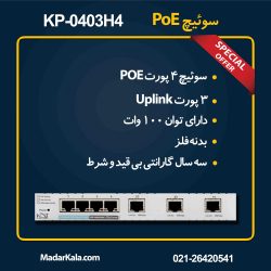 سوئیچ شبکه PoE کی دی تی مدل KP-0403H4 دارای ۴ پورتPoE با سرعت یک گیگابیت بر ثانیه با توان خروجی ۳۰ وات و ۳ پورت Uplink به صورت RG45 با سرعت یک گیگابیت بر ثانیه می باشد.